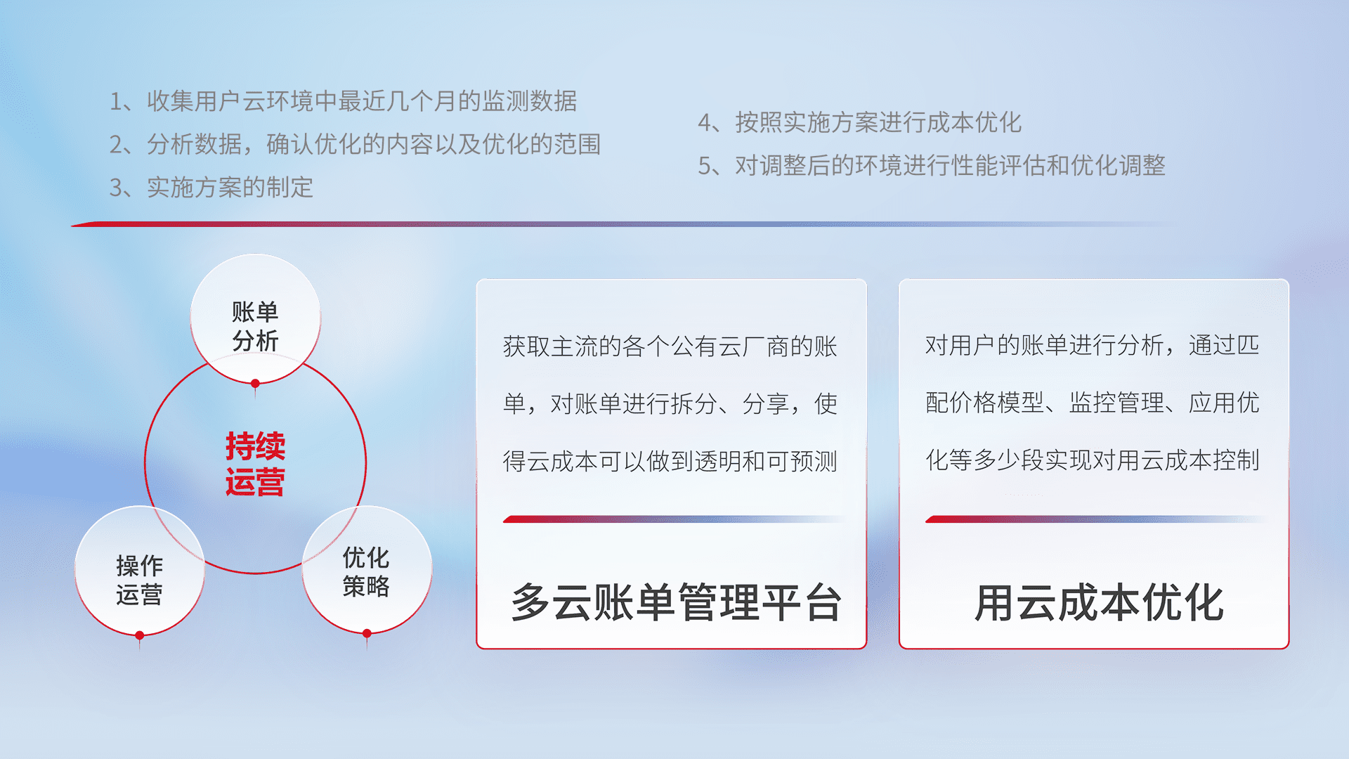 通过多云纳管,,,以统一的资源数据模型把客户的云资源进行抽象和封装,,,进而实现对多云资源的统一操作,,,保障云资源管理的可靠性、、、稳定性与可用性。。量身定制化运维内容,,配置、、、、开发运维、、补丁管理、、、、备份、、、、监控、、、认证和访问管理、、审计和日常巡检等,,,保障在用云过程中的可靠度,,,,稳定度以及高可用率。。
