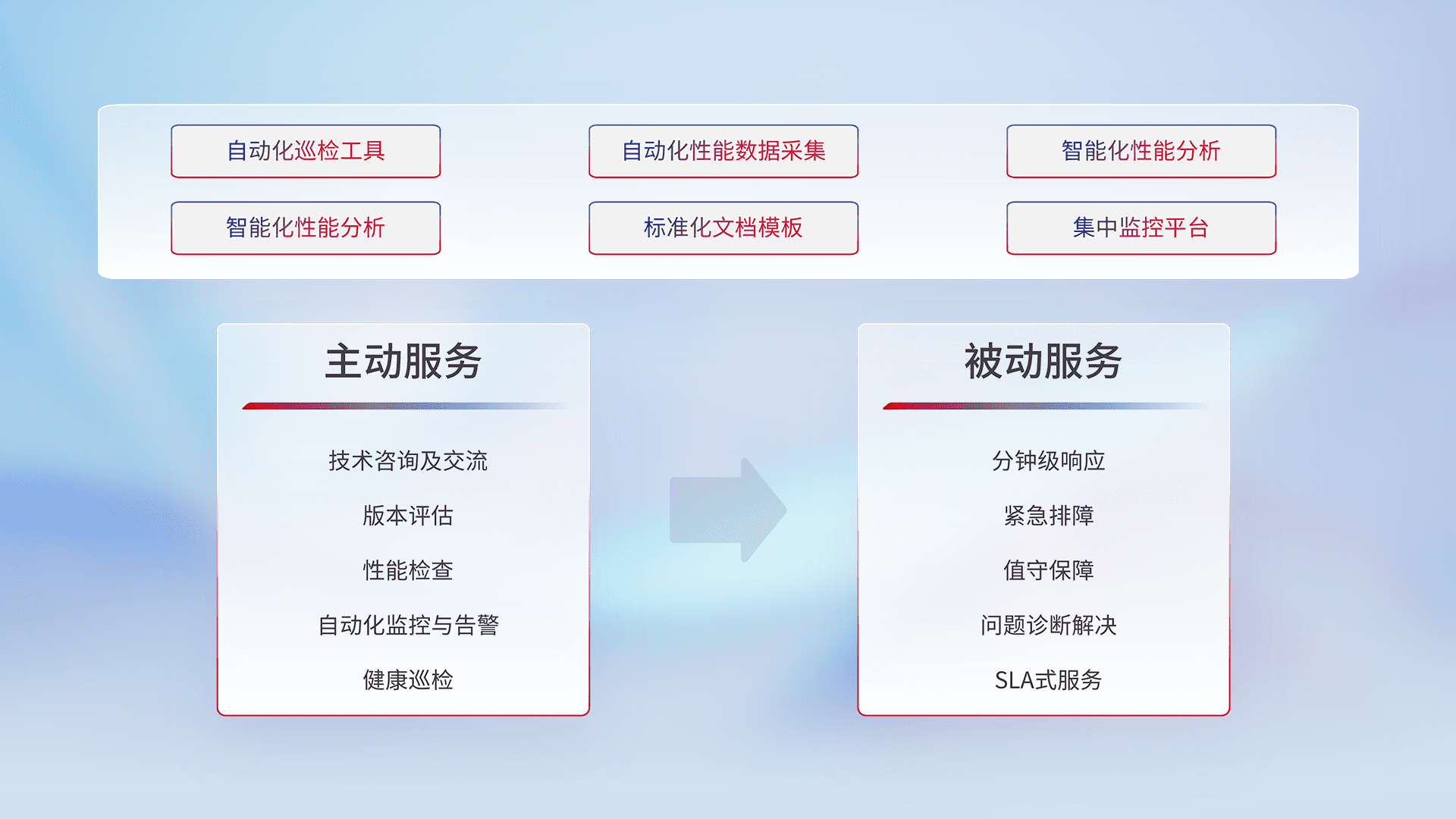 智能化工具和标准化文档,,保障服务质量,,,,提供主动服务(包含技术咨询、、、、版本评估、、、、性能检查、、、自动化监控与告警、、、健康巡检)和被动服务包含(分钟级响应、、、紧急排障、、、值守保障、、、问题诊断解决、、SLA服务)。。