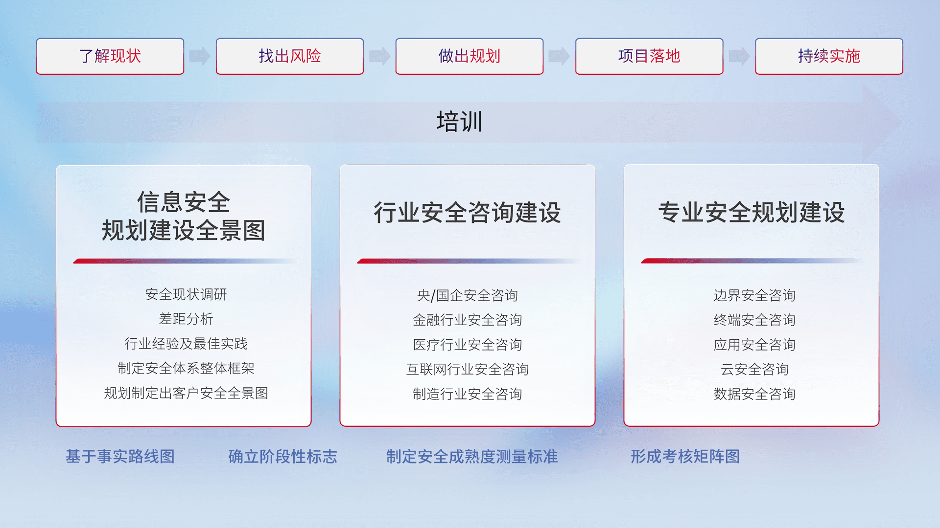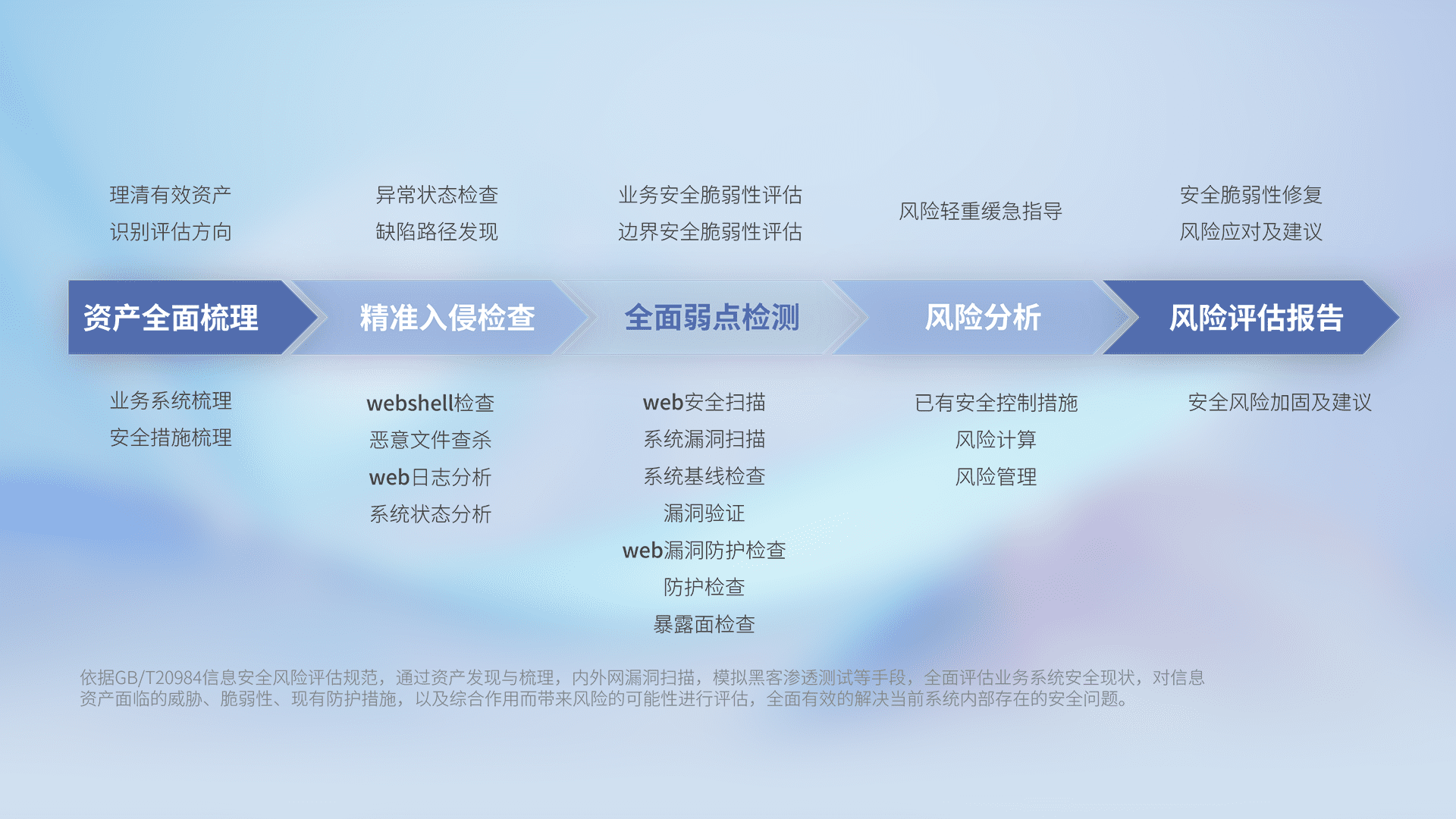 针对客户行业特性,,,,以专业的安全服务+多厂商联合解决方案提供专属的一站式安全管理服务,,,,帮助客户全面感知网络空间威胁,,,,基于识别、、、检测、、、、分析、、防护、、监测、、、、响应的服务理论模型,,,,从方案咨询、、集成交付、、评估验证、、优化加固、、运维运营,,,,致力于为客户提供完整的闭环管理式安全服务。。。。以实战经验为客户打造高抵御风险的安全体系,,,帮助客户发现威胁、、、对抗威胁、、处置威胁,,,不断积累安全对抗能力,,,持续保障数字化安全。。。